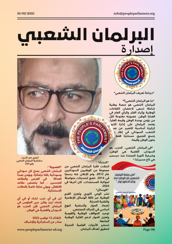 The People’s Parliament is a comprehensive national platform that seeks to embrace national competencies and enrich public thought and opinion in the causes of the country. His membership is open to anyone who believes in the unity of the homeland and its highest values. Parliament relies on managing diversity as a fundamental pillar for expressing the voice of the Sudanese people within the framework of a country that can accommodate all, excluding only those who betray the country and its values.